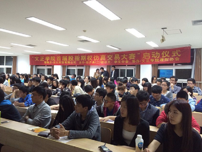 苏州大学文正学院首届股指期权仿真交易大赛于4月9日正式启动,作为本次活动的主办方,公司研究所所长张鹏在启动仪式做了期货与期货基础知识的专题讲座,结算部经理助理张锐向参赛学生介绍了股指期权仿真交易规则,并现场进行仿真交易演示。