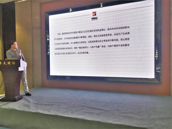 苏州创元和赢资本管理有限公司场外衍生品业务经理王泽南在《期货风险管理与实体企业服务》主题演讲中,简要介绍了期货基础知识,并从价格发现、风险管理、资金管理、库存管理以及供销等方面,就期货市场如何服务实体企业逐一进行了分述。对目前公司开展的“基差贸易、仓单服务、场外衍生品业务”三种展业模式进行了解读,并结合实际进行了案例分享,帮助参会企业和人员更好地了解掌握期货公司风险管理业务流程和具体做法,为后续双方业务合作做好铺垫。