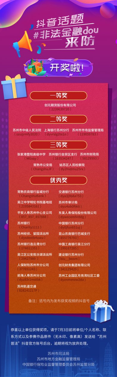为普及金融法律知识,提升全民防范意识,由苏州市司法局、苏州市地方金融监督管理局,以及中国银行保险业监督管理委员会苏州监管分局联合开展了一次“非法金融dou来防”抖音短视频话题挑战赛活动创元期货参赛并取得了第一名的好成绩。