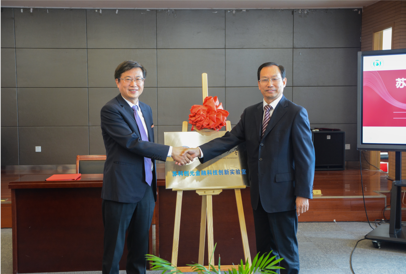 随后在全场领导和嘉宾的共同见证下,吴文胜、王东田分别代表公司和学校签署了战略合作协议,出席活动的领导为“金融硕士研究生实践基地”“苏科创元金融科技创新实验室”进行了揭牌。