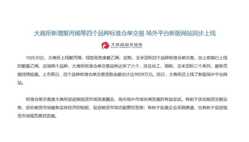 10月30日,大连商品交易所(下称“大商所”)标准仓单交易业务新增聚丙烯等四个品种正式挂牌交易,创元期货风险管理子公司苏州创元和赢资本管理有限公司(下称“和赢资本”)通过前期积极准备,成功参与玉米淀粉的首日交易,在大商所标准仓单平台上挂牌卖出了相同规格的标准仓单300手(共3000吨)。