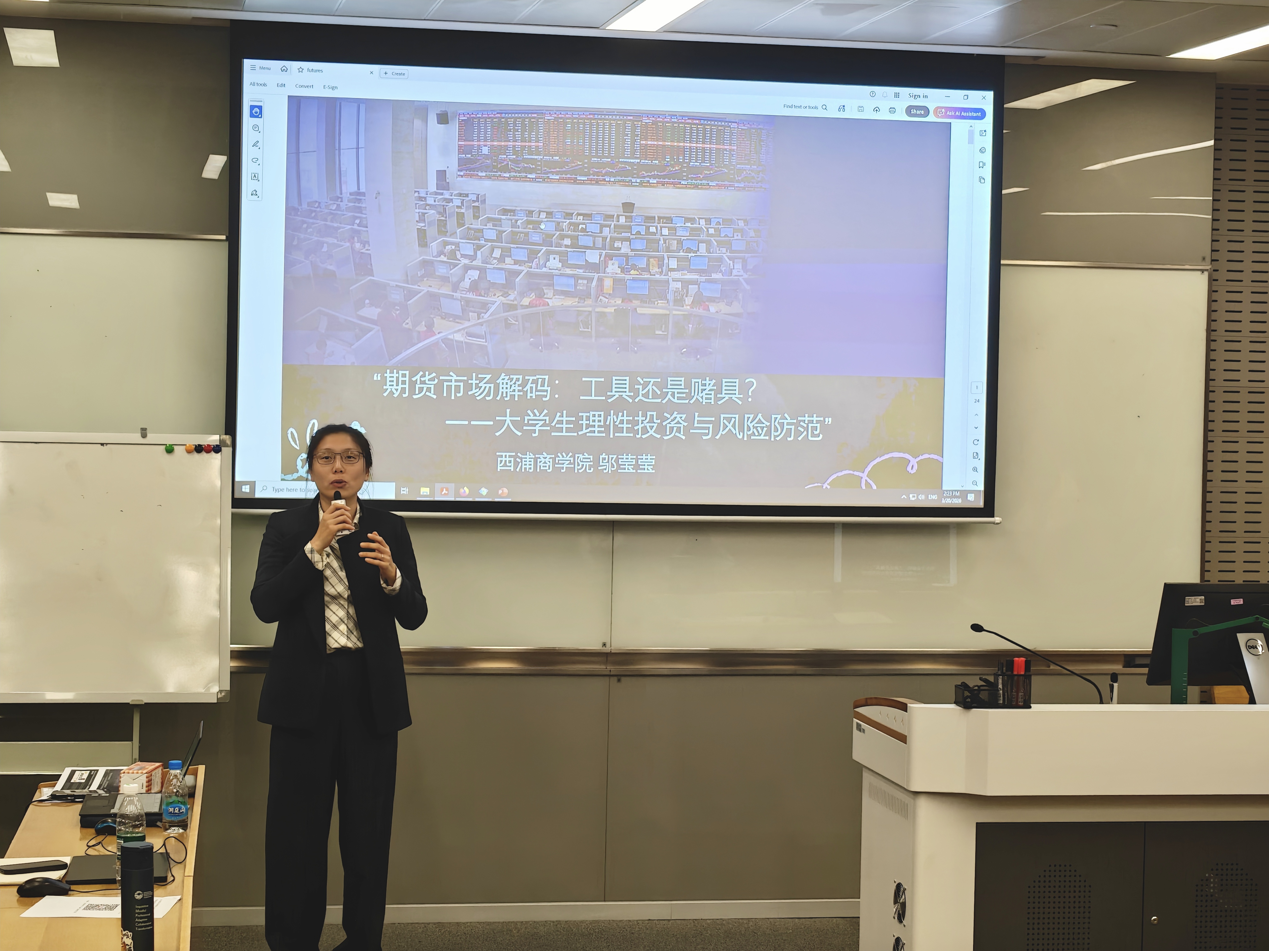 西交利物浦大学邬莹莹博士以“期货市场是工具还是赌具”为切入点,传授非法证券期货活动的识别方法,引导学子建立理性投资思维。